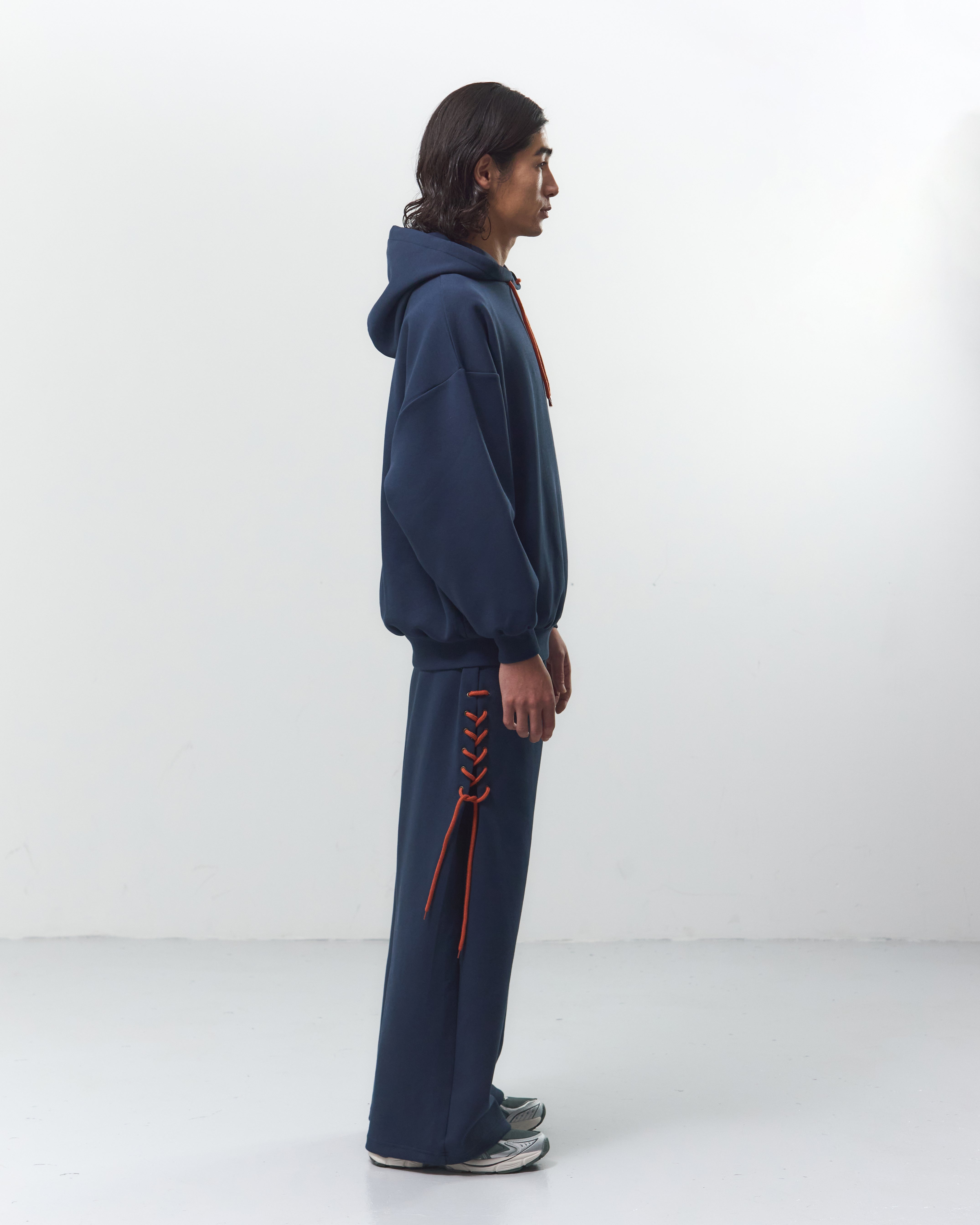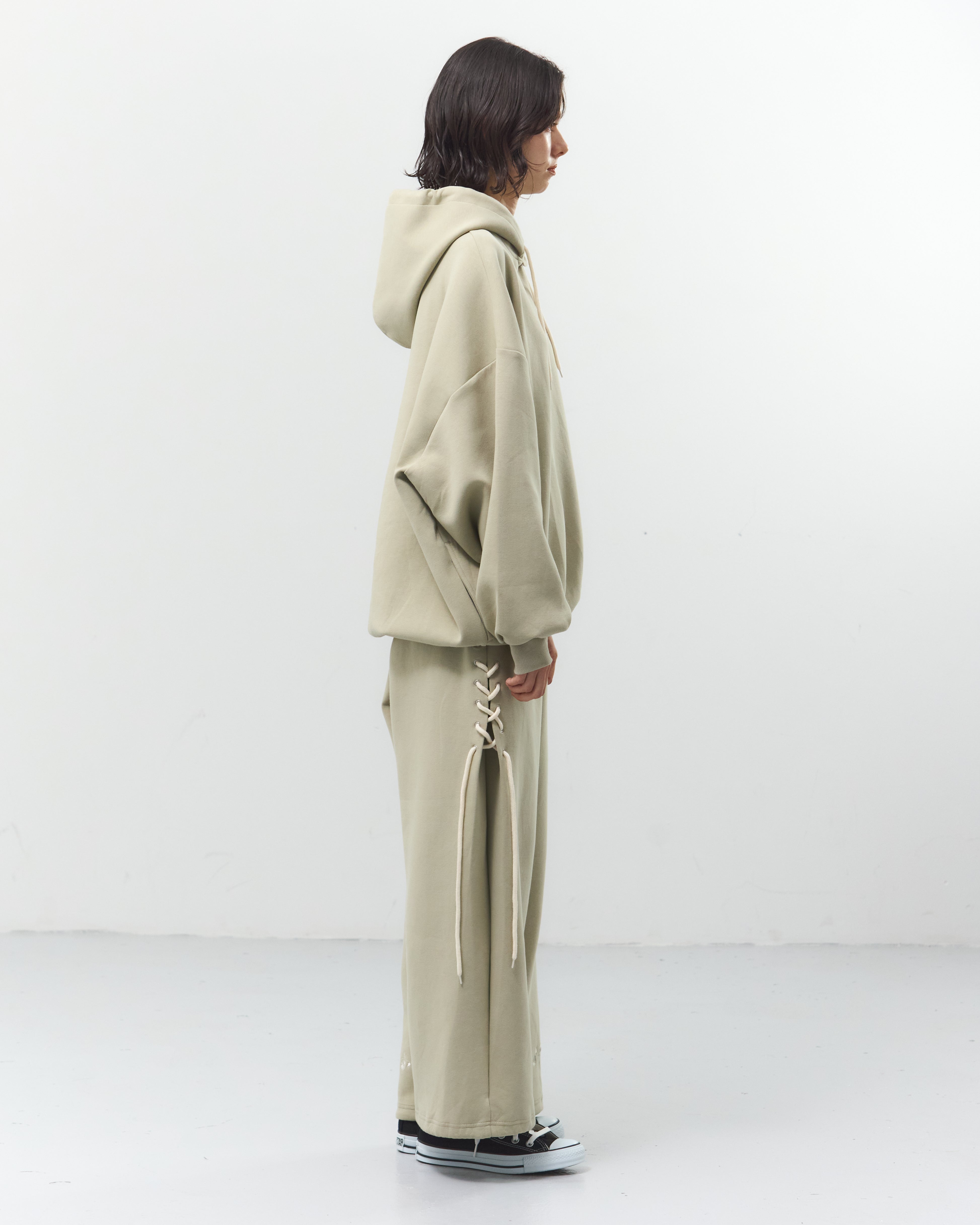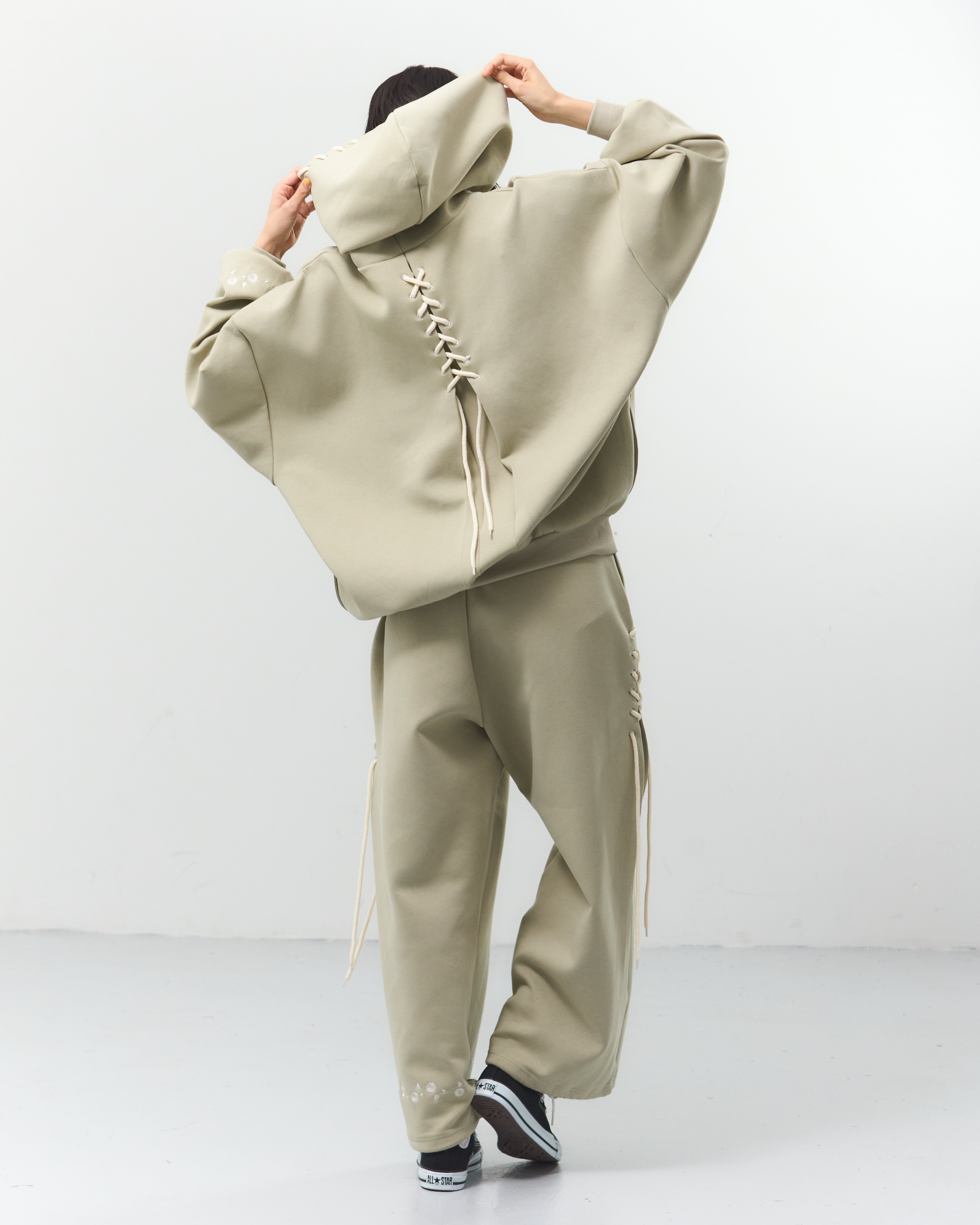 ブーツストラップパーカー(8/31)に合わせて、イラストのスニーカーの靴紐をレースアップとしてパンツのサイドデザインに落とし込みました。