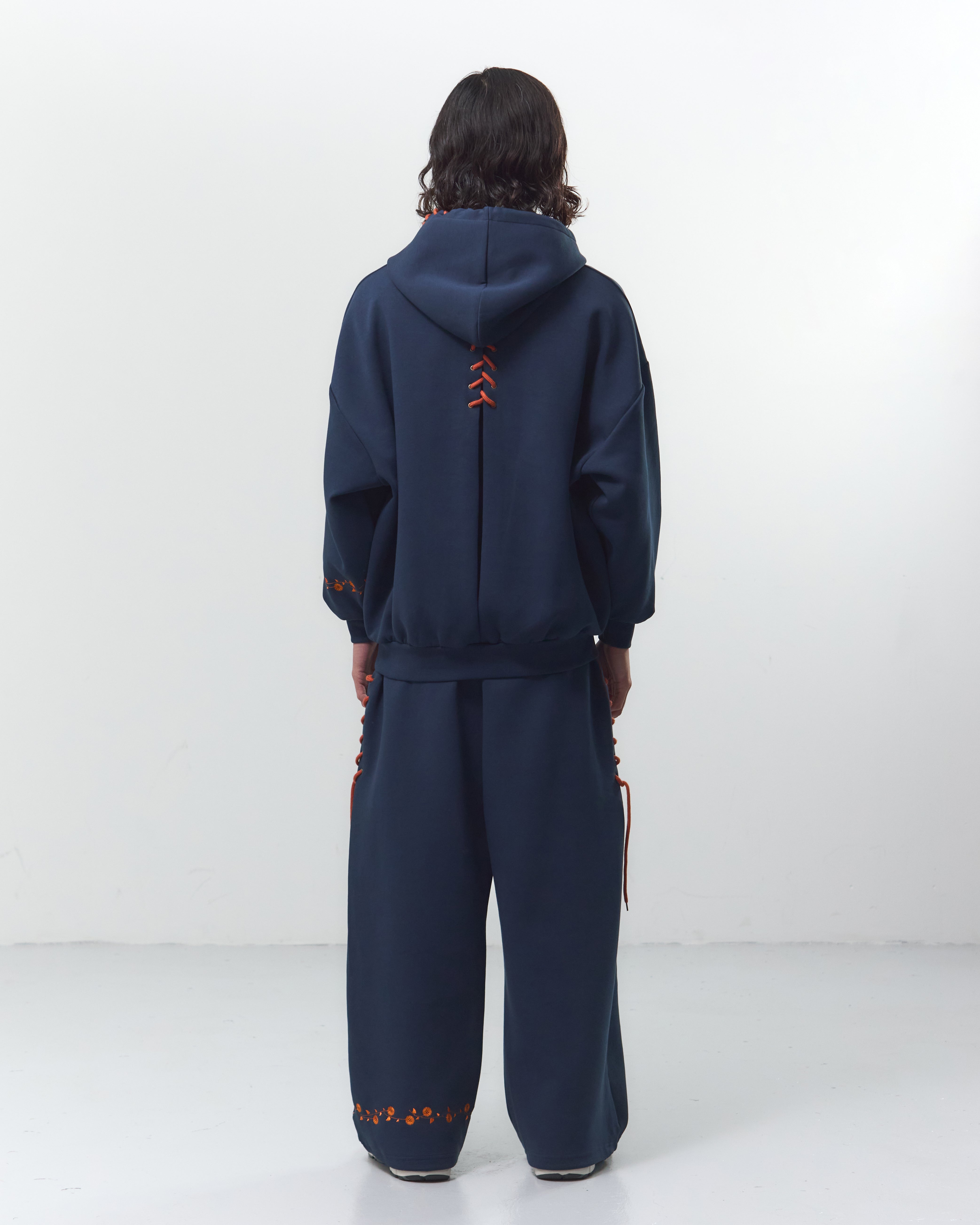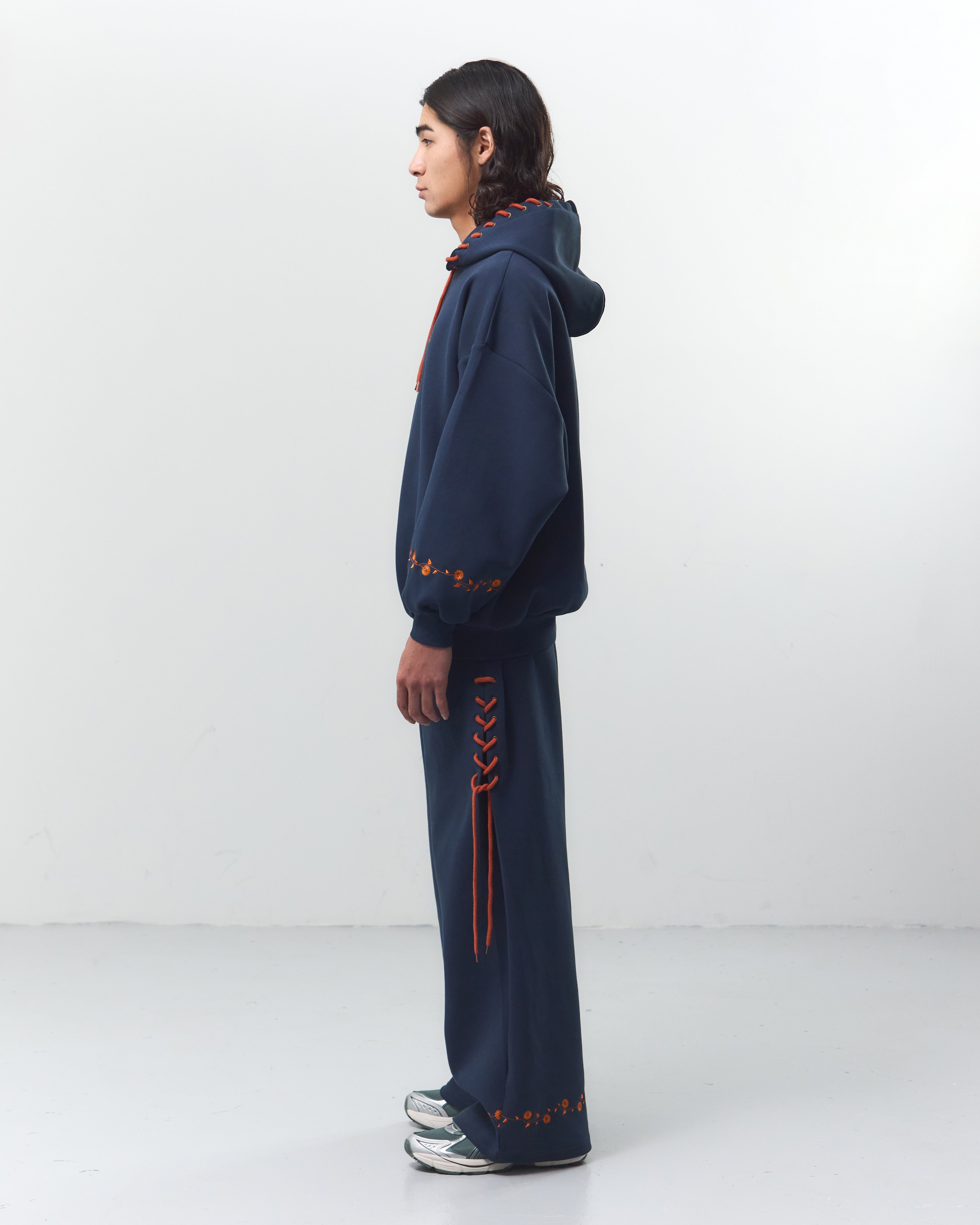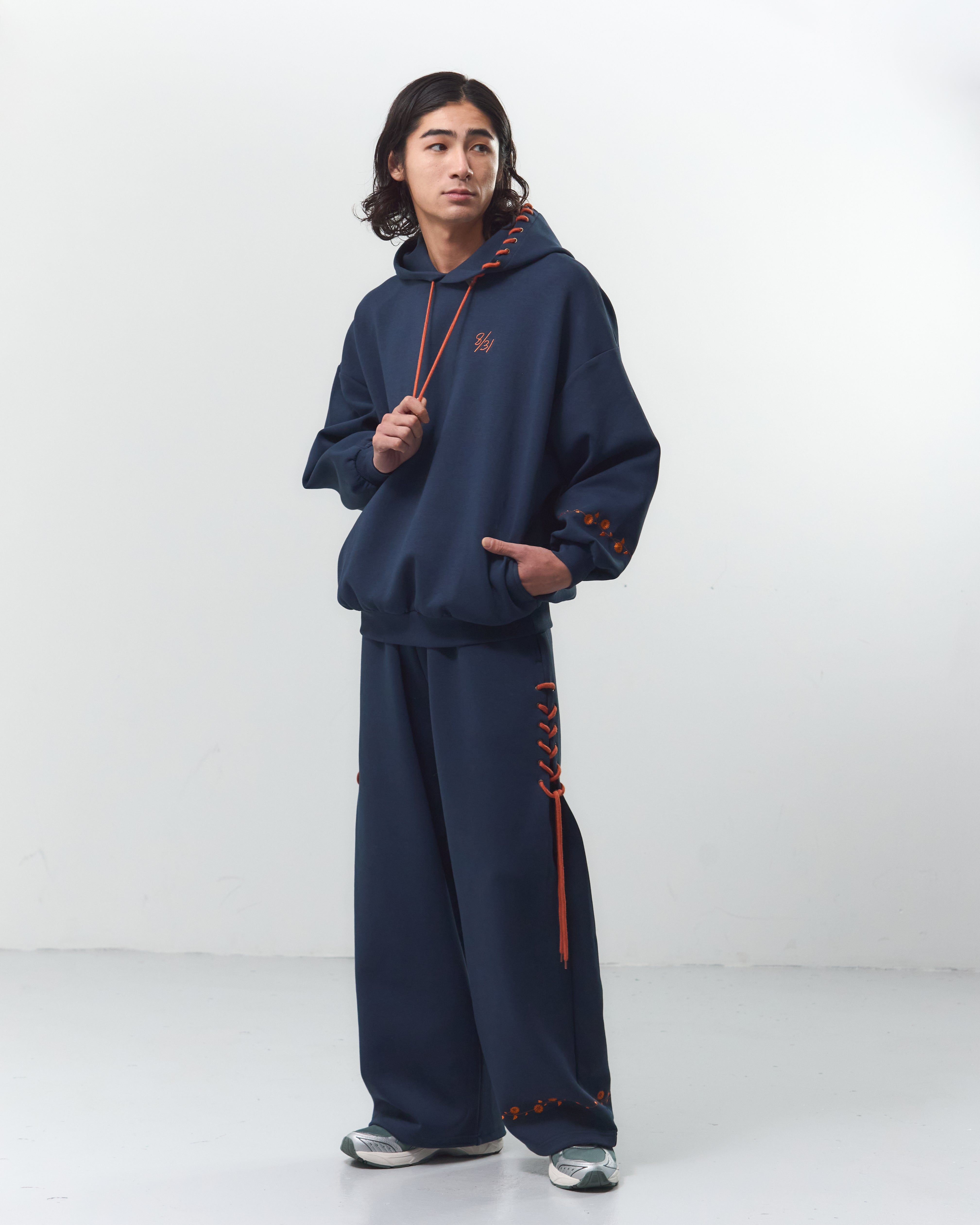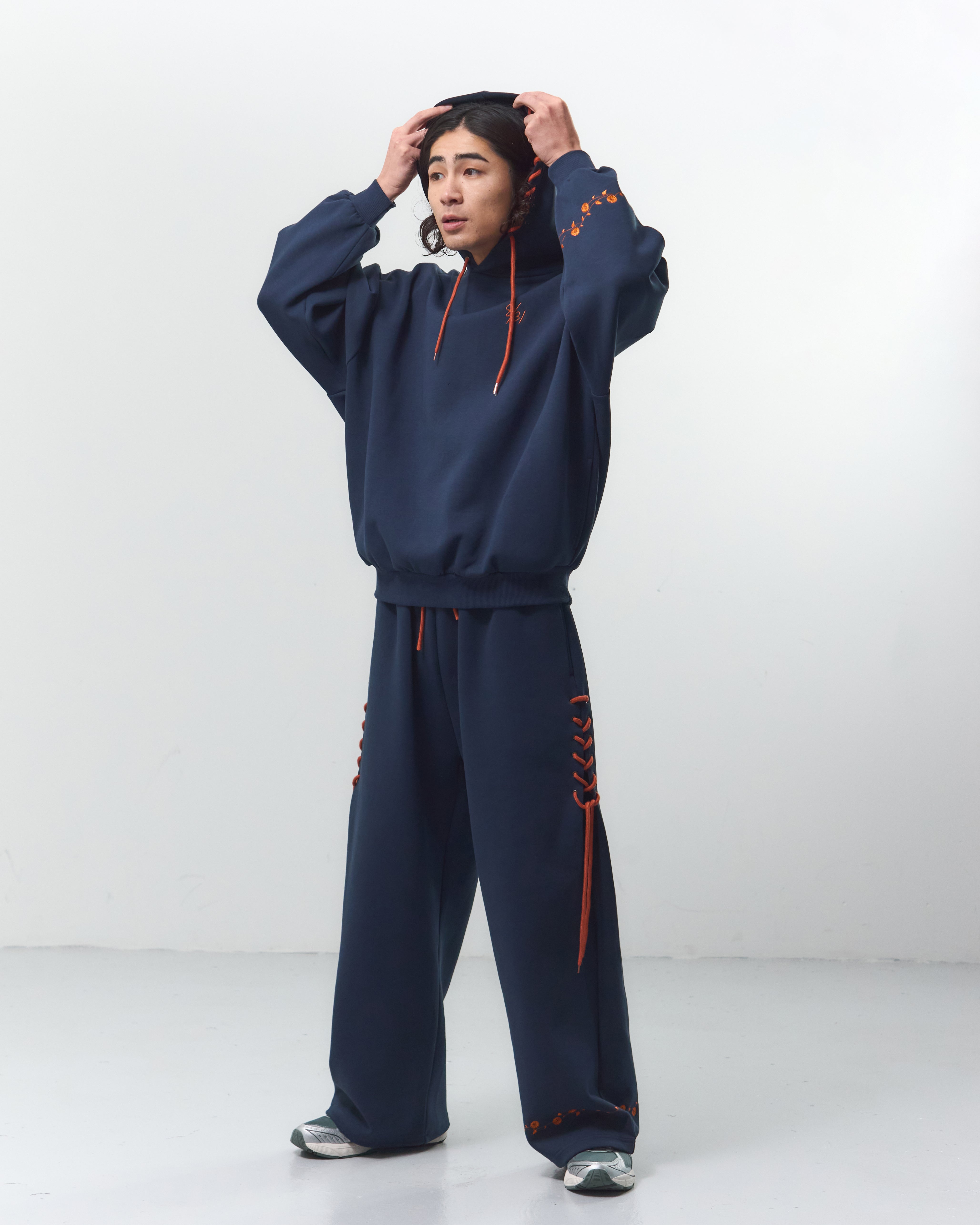 ブーツストラップパーカー(8/31)に合わせて、イラストのスニーカーの靴紐をレースアップとしてパンツのサイドデザインに落とし込みました。
