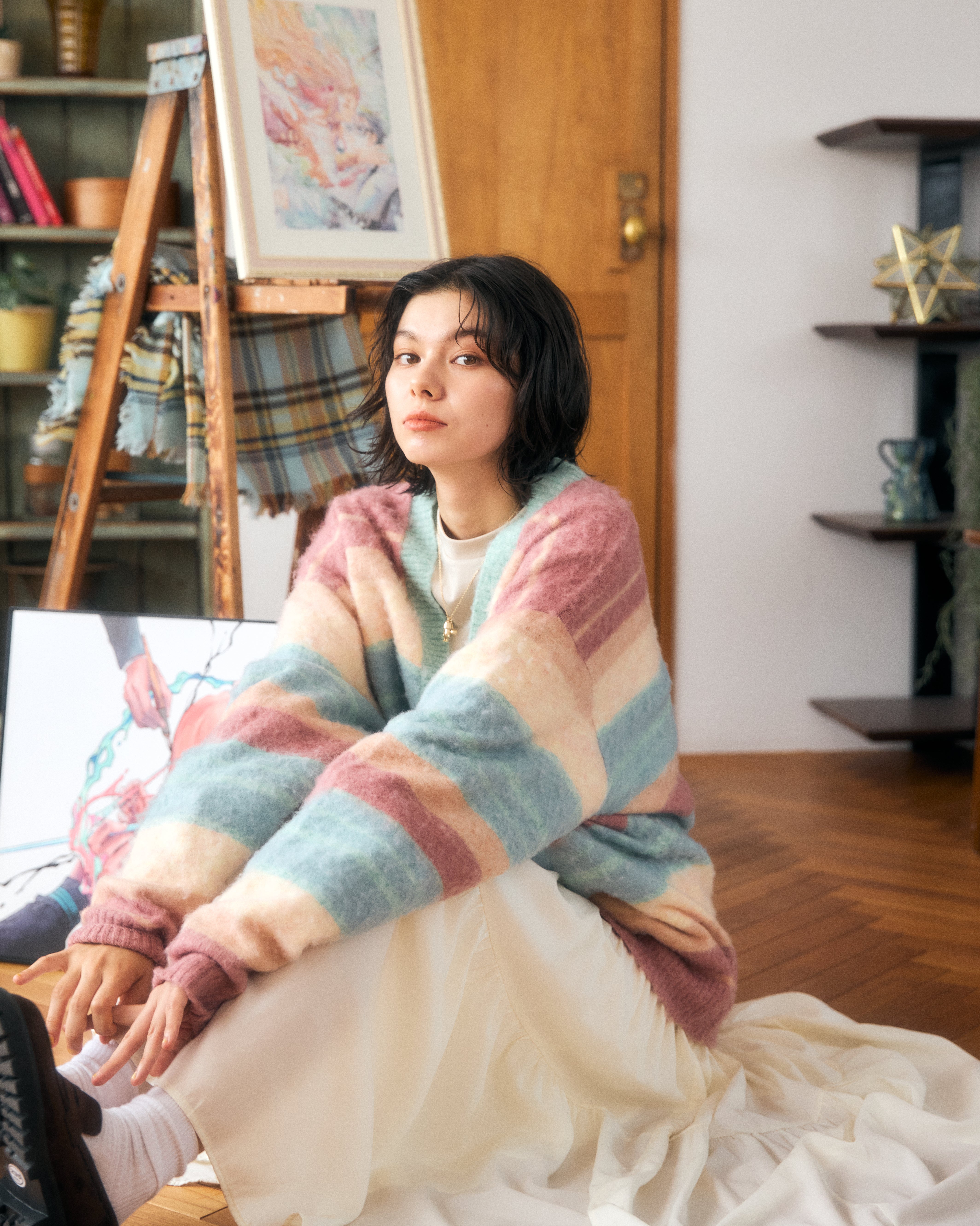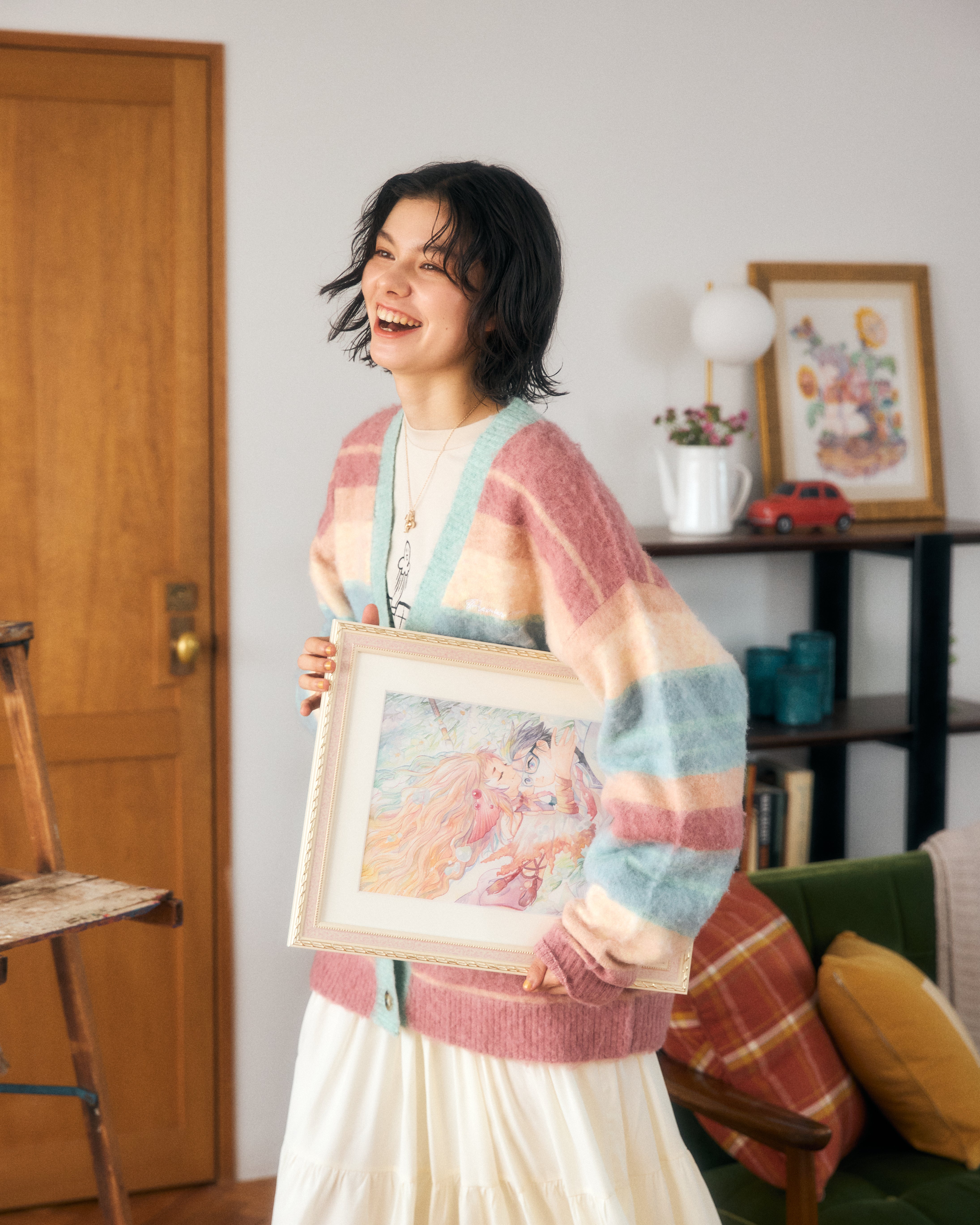 さやのイラスト「金魚と初恋」から着想を得たモヘアカーディガン。