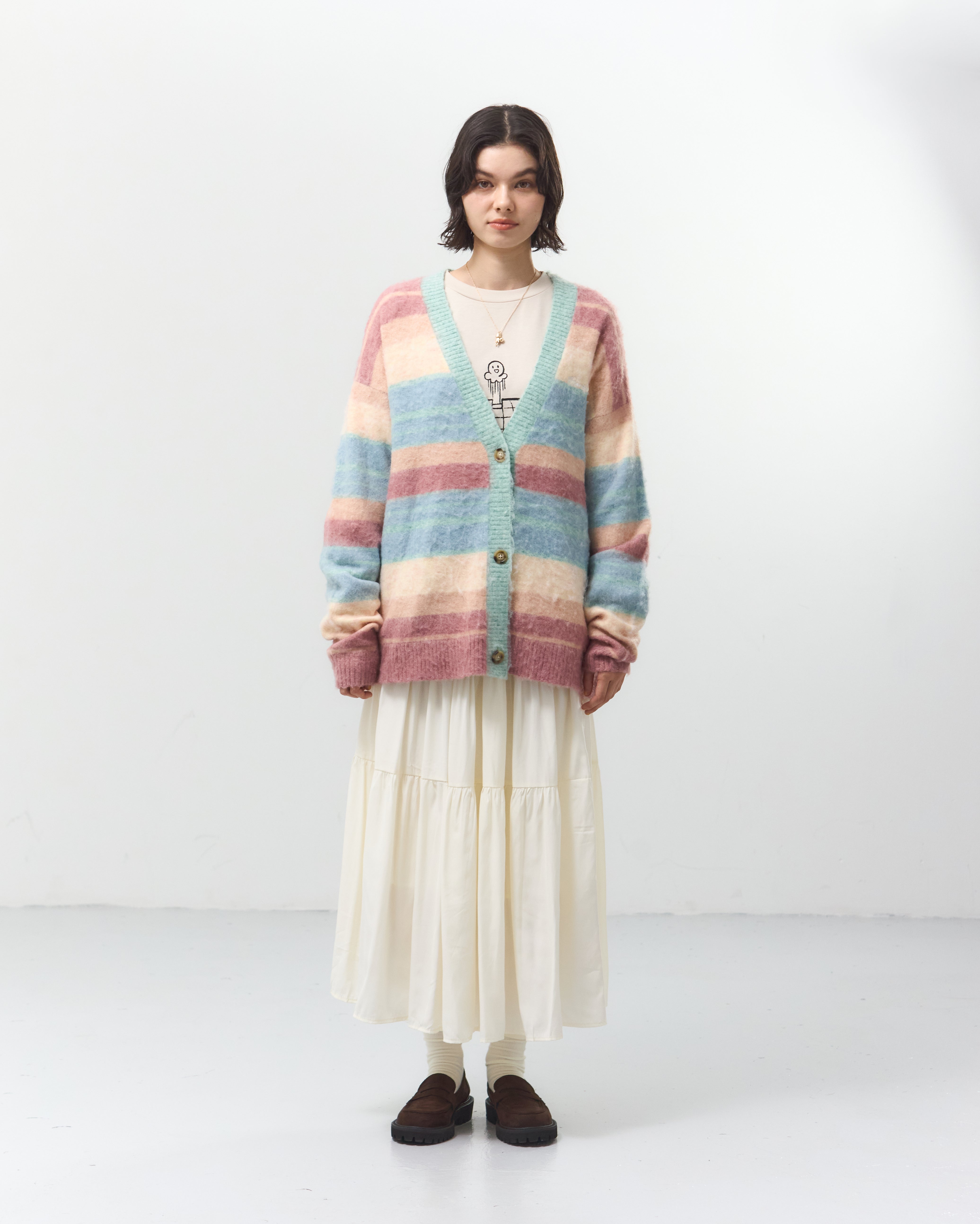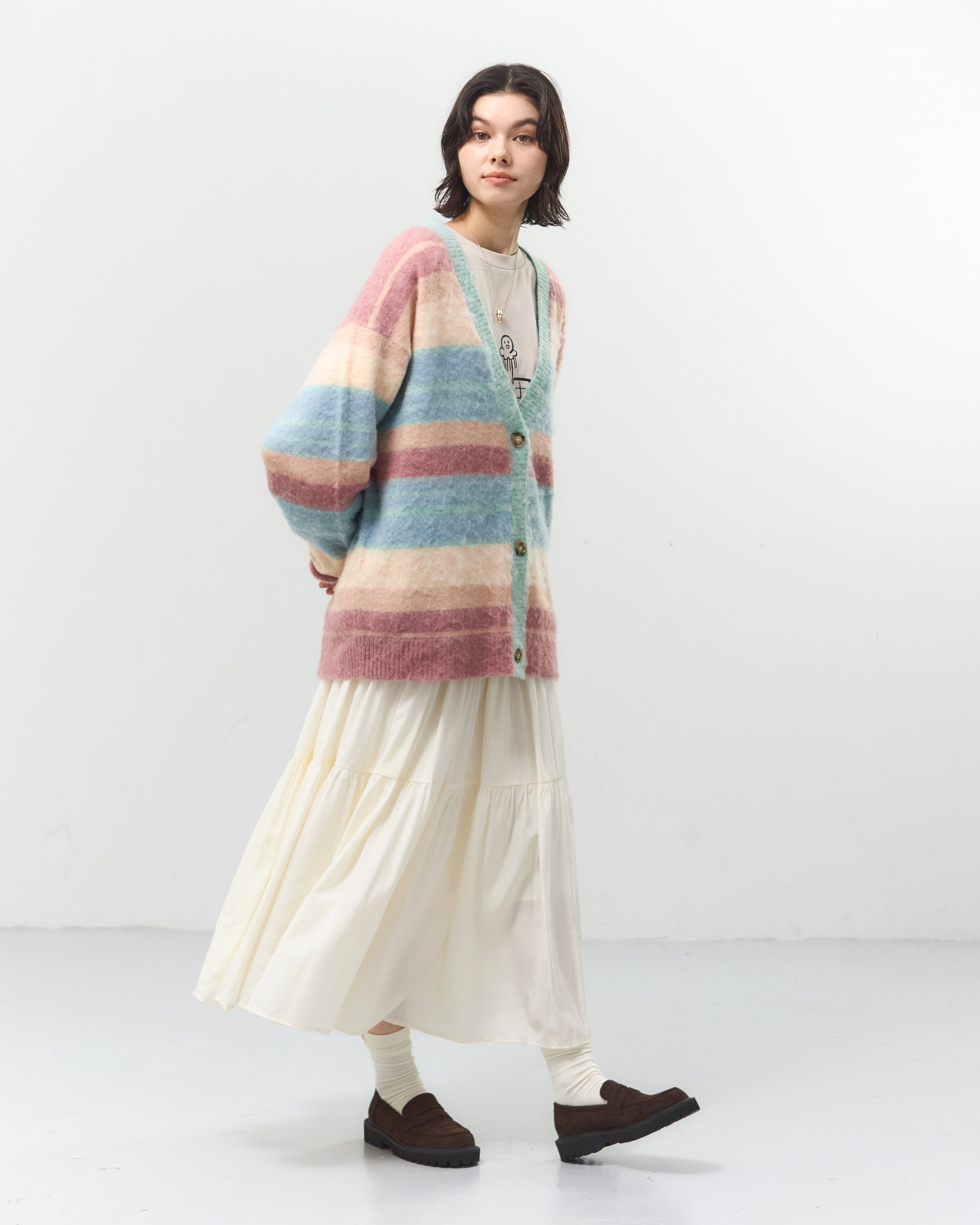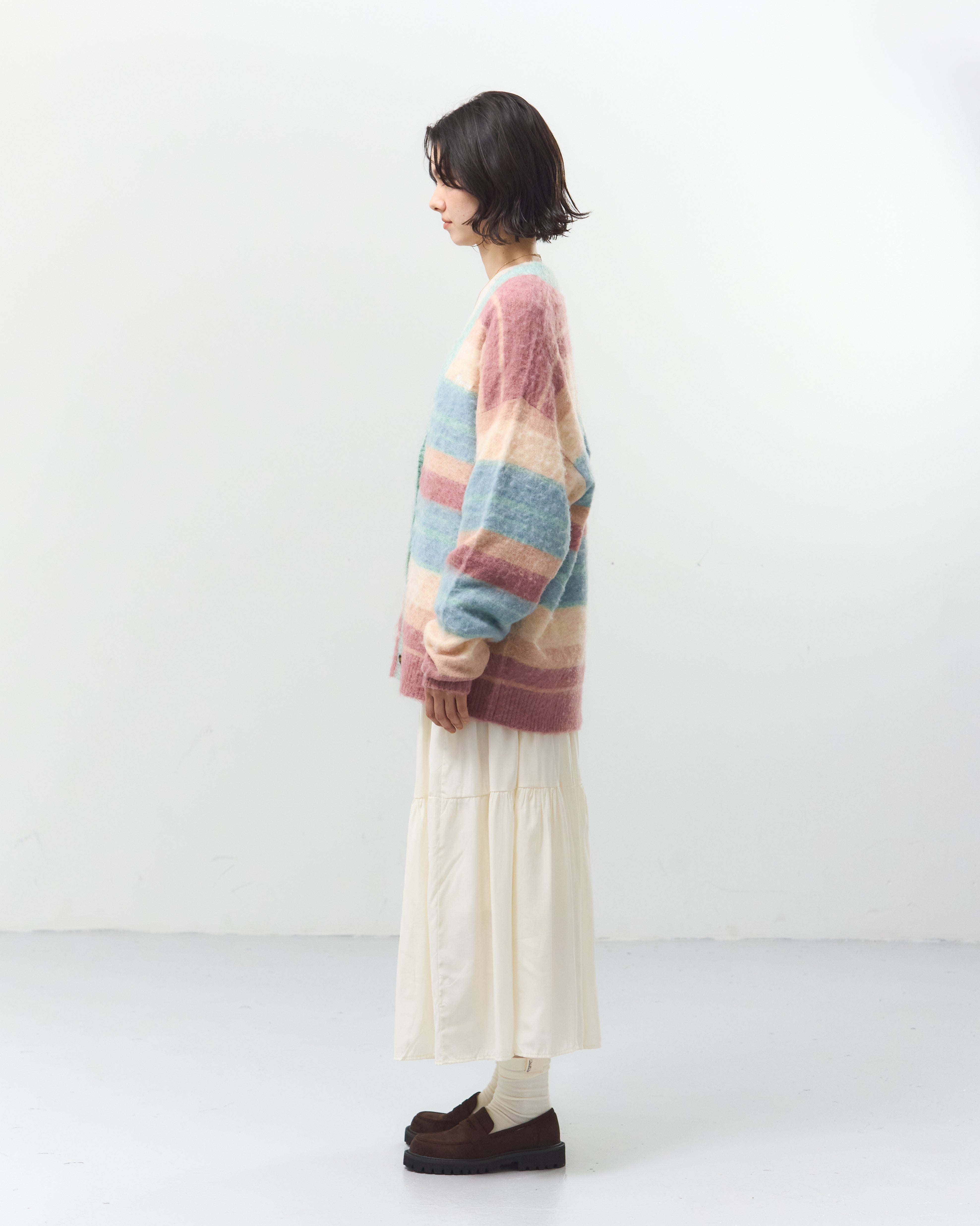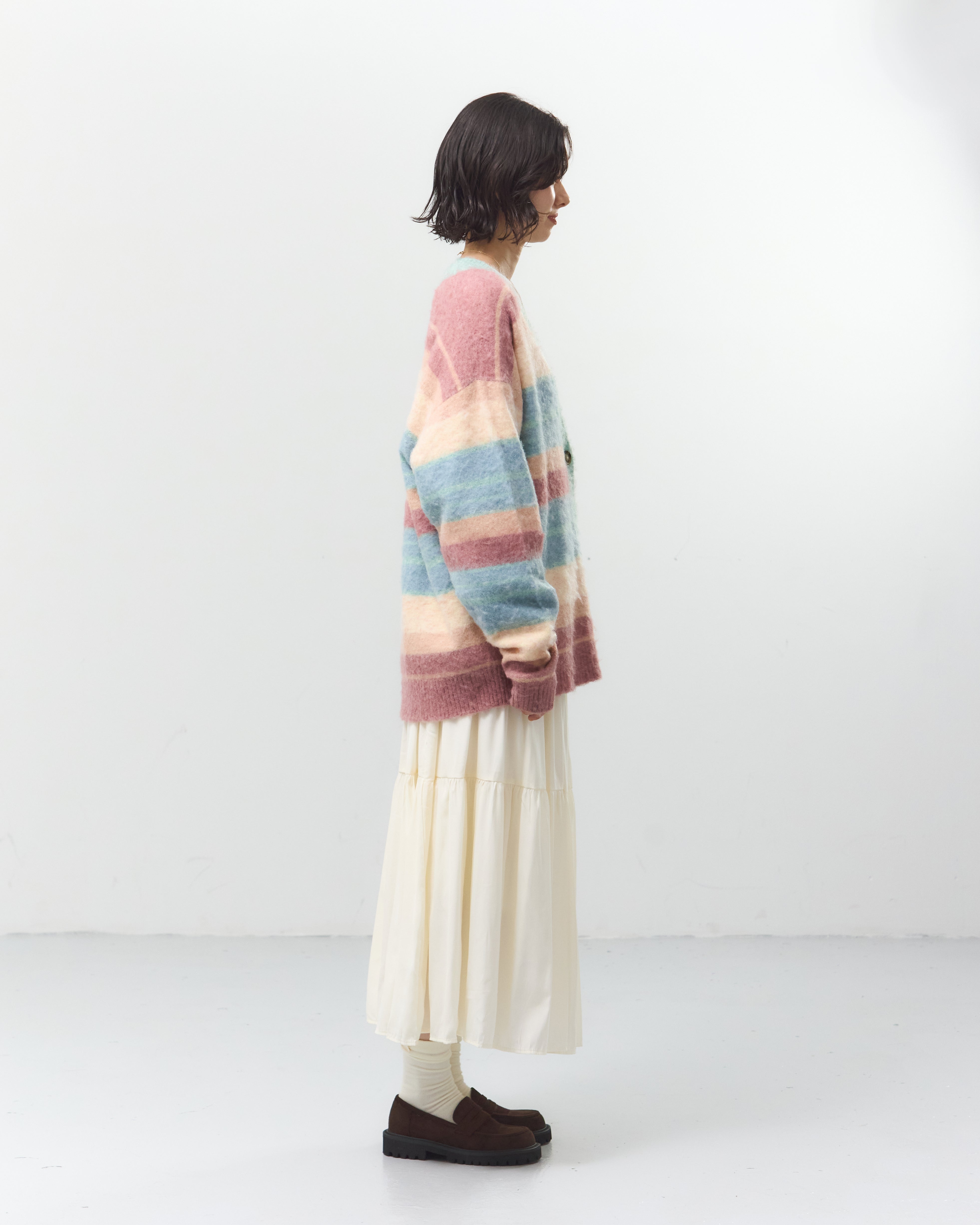 優しいカラーが印象的でコーディネートに甘さと柔らかさを添える一枚です。