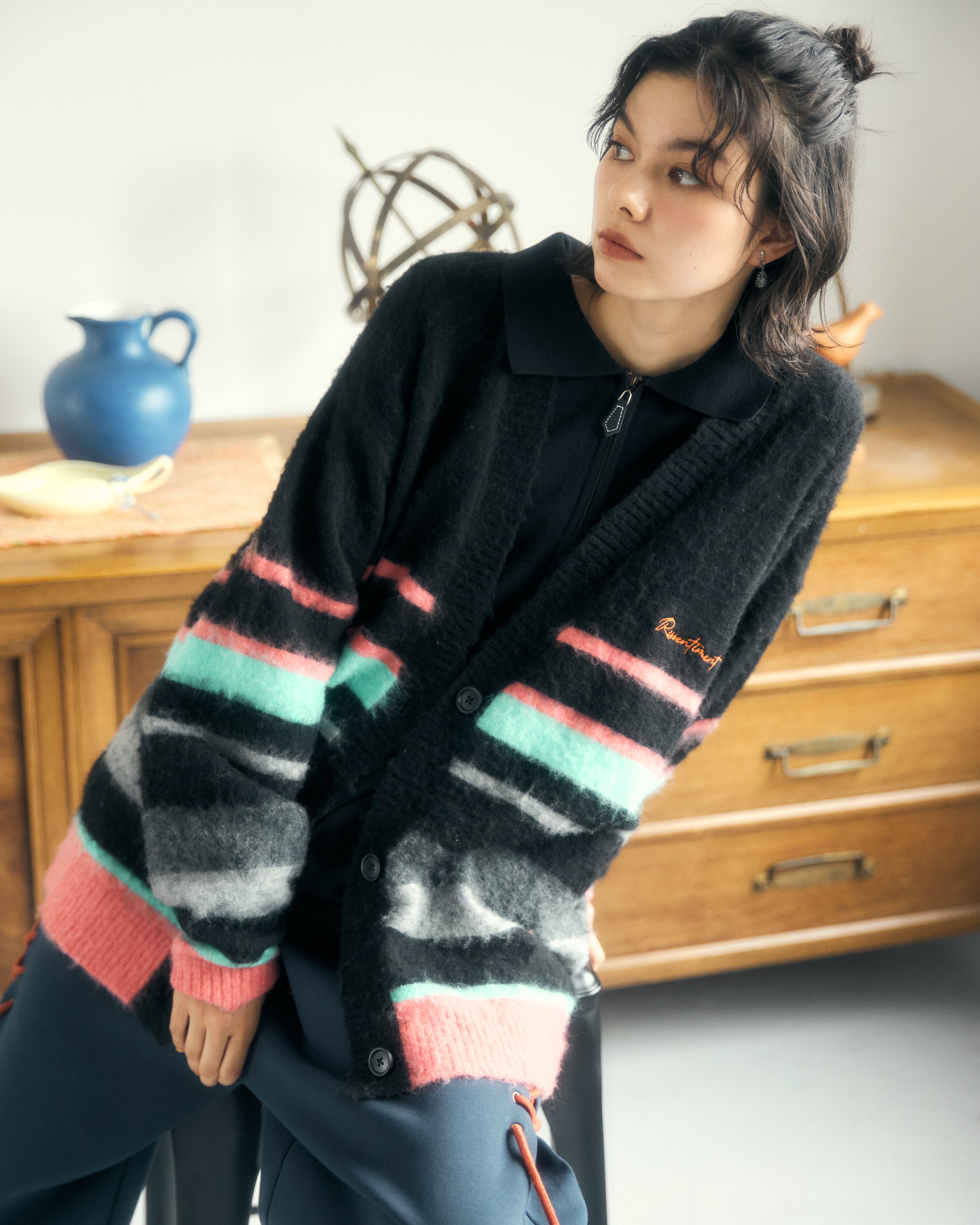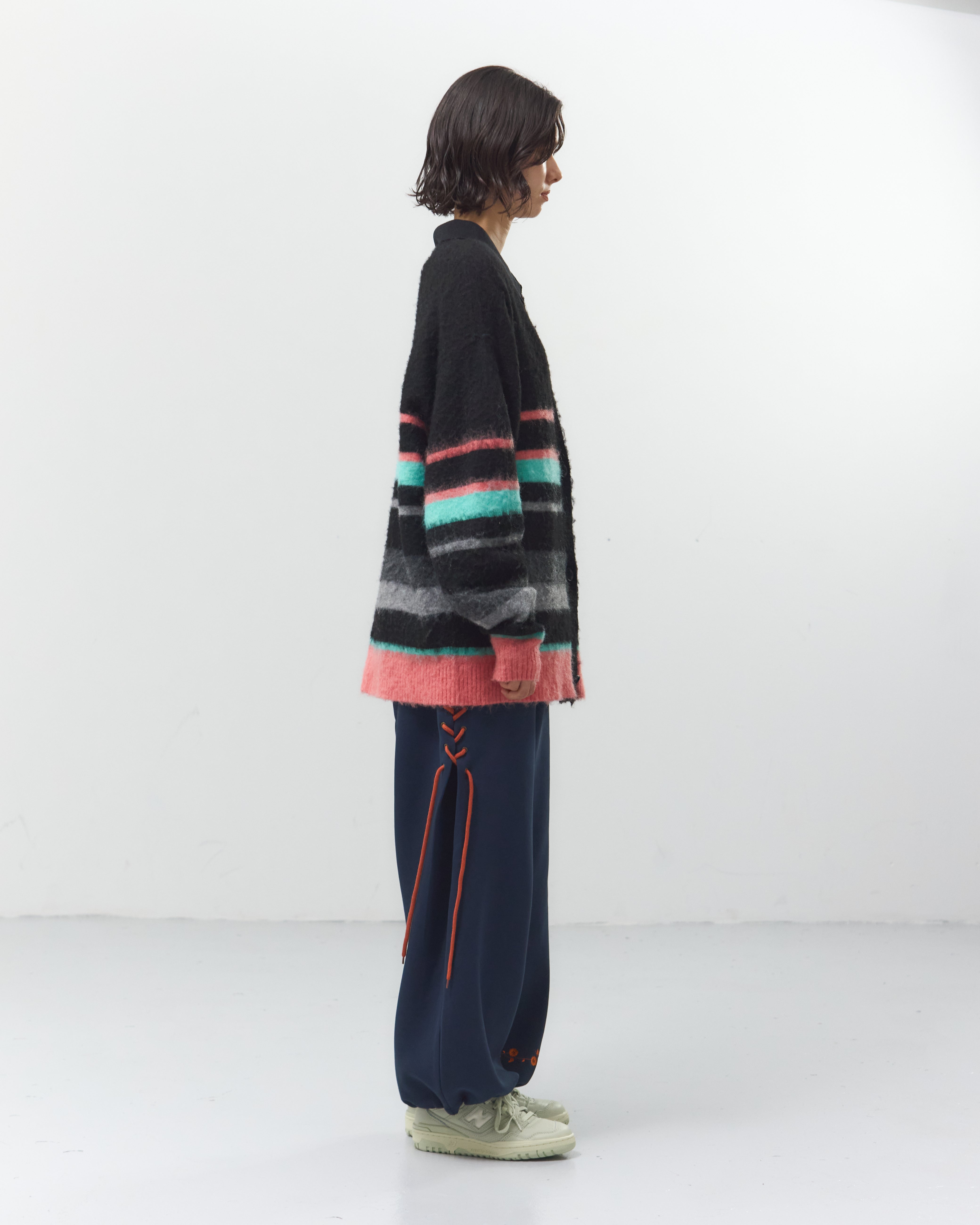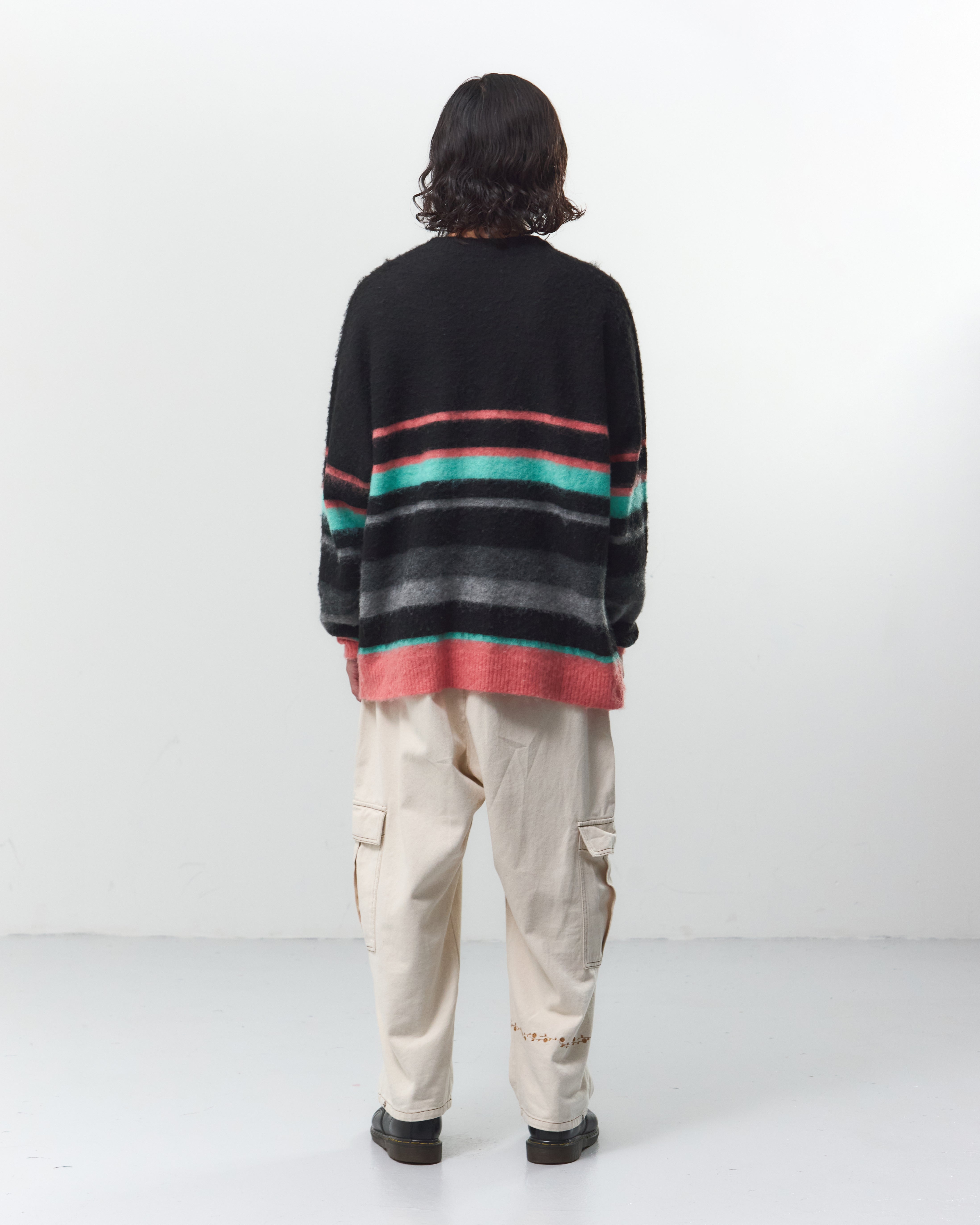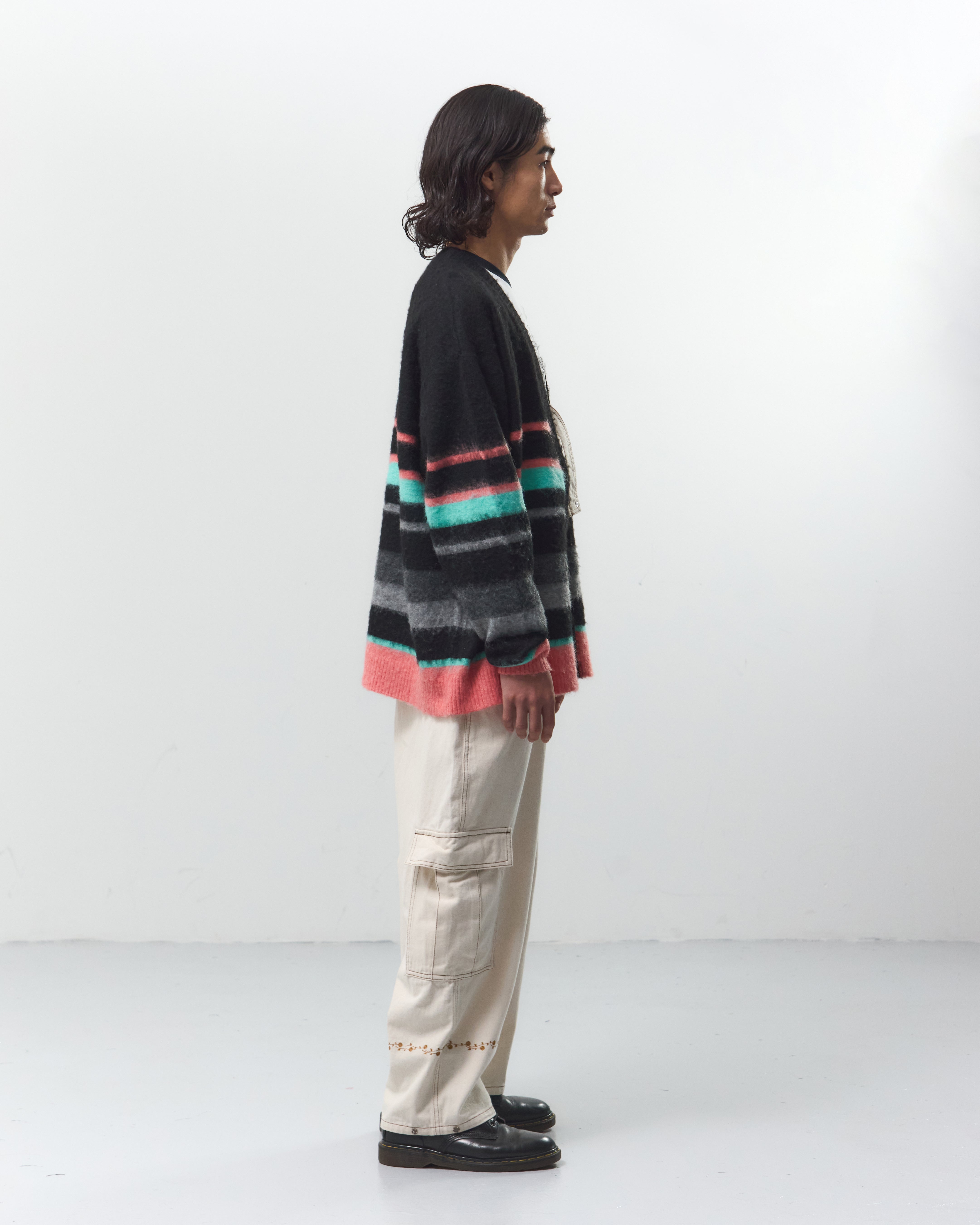 げん自ら配色デザインを作成し、ビビットなカラーで存在感を出しながらも攻めすぎていないバランス調整にこだわりました。ふわっと軽く柔らかいモヘア素材で肌触りも抜群。